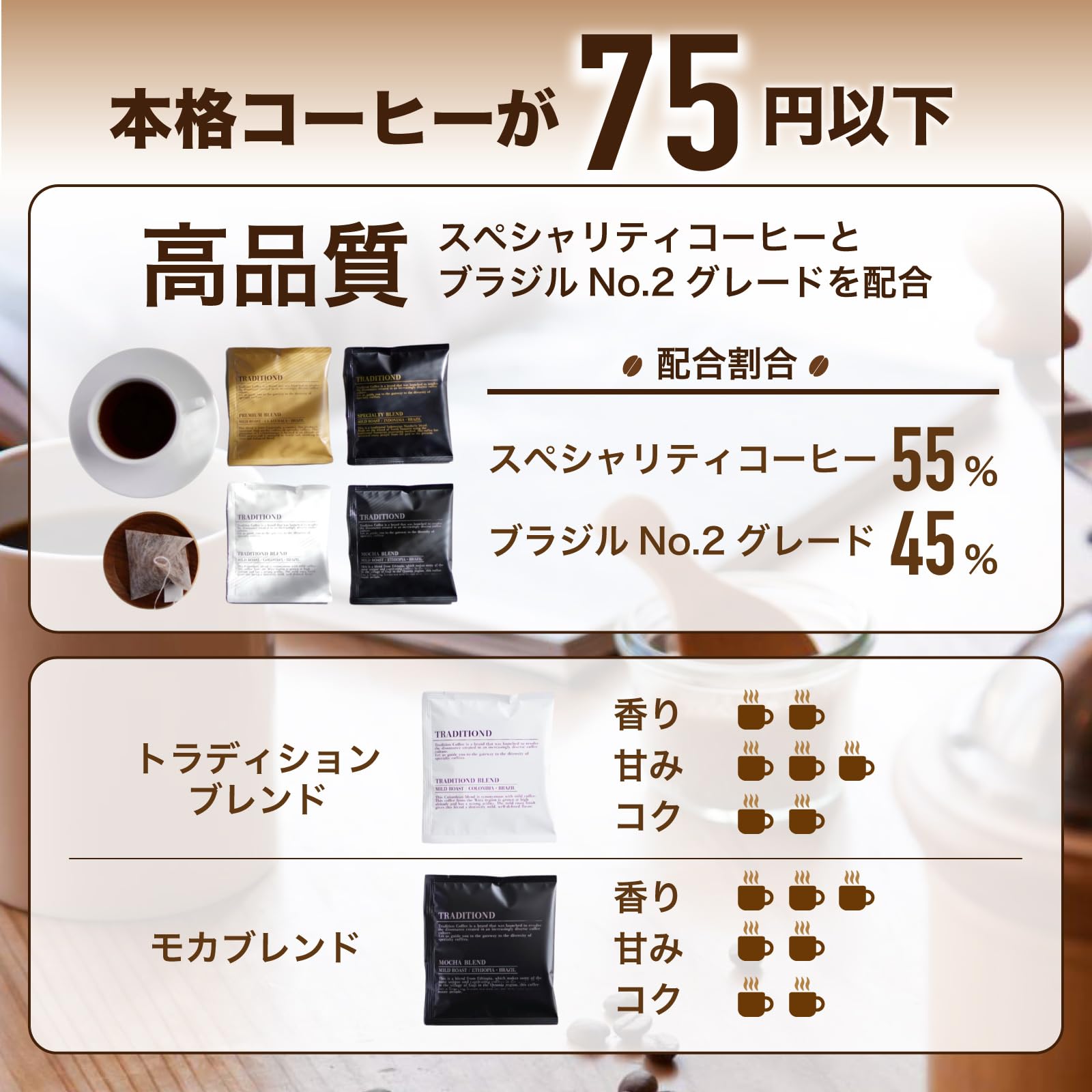 • ✅[ トラディションドブレンド ティーバッグコーヒー]は、100%アラビカコーヒーのみを使用し、 透明感のある飲みやすさが特徴です。厳選されたアラビカ豆から引き出されたまろやかな酸味と甘味が調和し、 優雅な風味を楽しめます。ティーバッグ形式のため、お湯を注ぐだけで簡単に本格的なコーヒーを 味わえる手軽さも魅力です。均一に抽出されるため、ムラのない澄んだ香りとクリアな後味が広がり、 リラックスタイムや気軽なコーヒーブレイクにぴったりの一杯