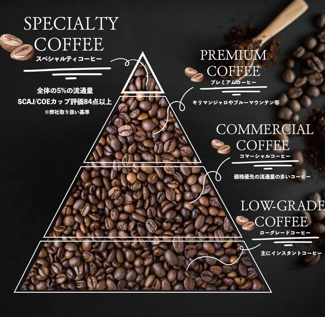 • ✅[アラビカ種の中の4つのグレード] 最高品質のスペシャルティグレードは、SCA基準で80点以上の豆で、 欠点が少なく、フルーティーで豊かな風味が特徴です。次にプレミアムグレードがあり、70〜80点の高品質な豆で、 バランスの取れた酸味や香りが楽しめます。コマーシャルグレードは大量生産向けで、 欠点豆が含まれることが多く、シンプルな味わいです。グリーングレードは輸出用の豆で、欠点が含まれることもあり、企業の基準で焙煎・ブレンドされます
