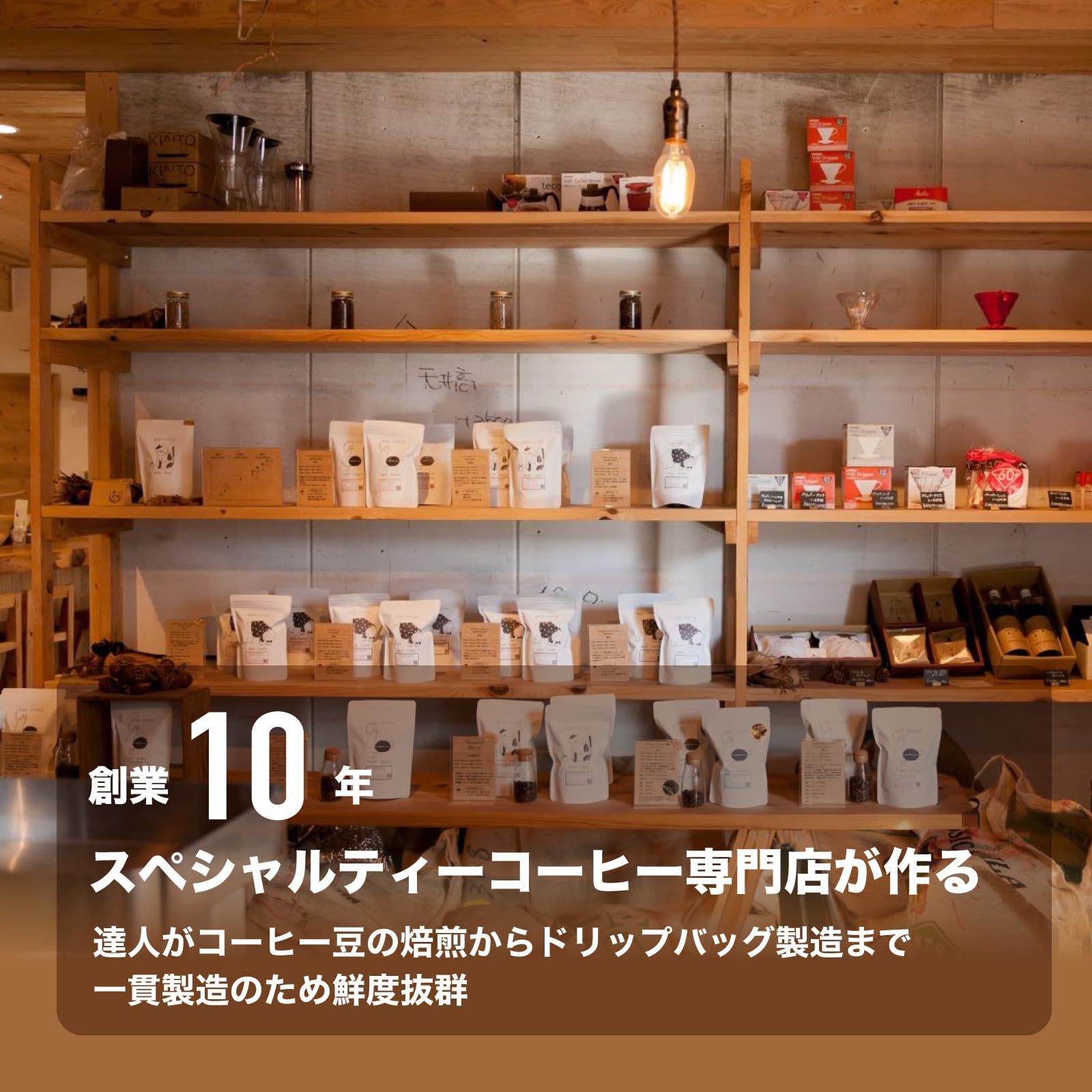 • ✅創業10年スペシャルティーコーヒー専門店が作るドリップバッグ。達人がコーヒー豆の焙煎からドリップバッグ製造まで一貫製造のため鮮度抜群。 しかも、ティーバッグタイプなのでお湯を注ぐだけで完成。簡単お湯を注いで3分。 窒素ガス充填して鮮度の劣化を抑え、開封した瞬間にフレッシュなコーヒーの香りだから安心してプレゼント